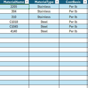 Add materials used in your shop to this list, along with your quoted prices, and Excel-A-Rate will bring these materials and prices into your quoting process automatically.
