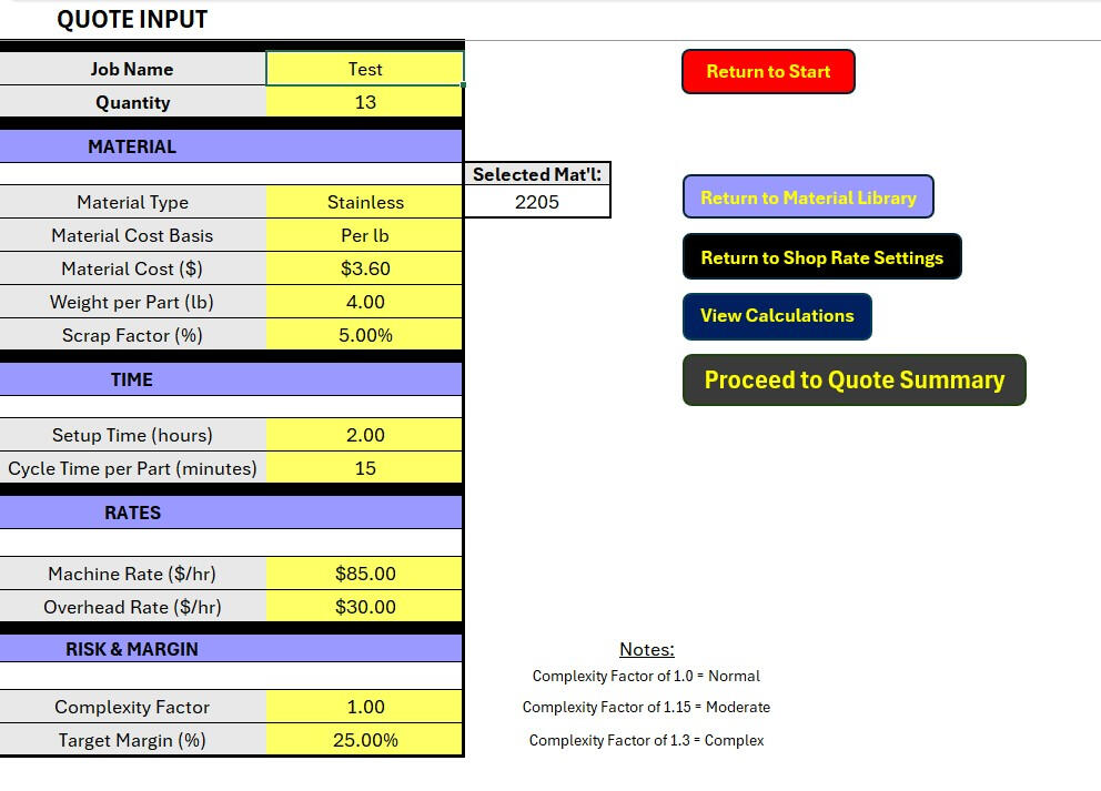 Once you have your materials and shop rates set, those values are automatically entered into your Quote Input screen. Enter your setup and cycle times, along with the weight of each part, and Excel-A-Rate takes it from there.Is the part you're making complex? Change the Complexity Factor on this screen to reflect the difficulty level of the job and Excel-A-Rate will use an internal multiplier to make sure you are fairly paid.